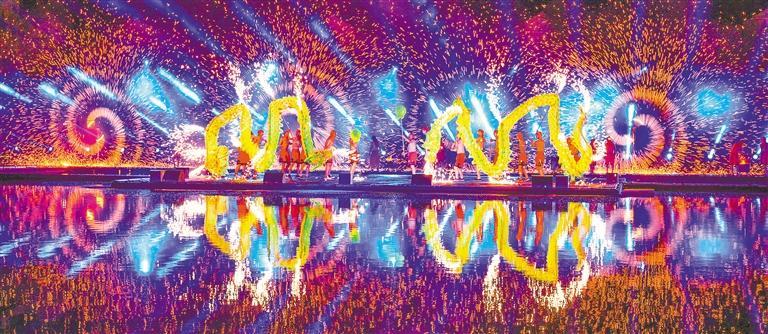 ▼4月26日,江苏省连云港市渔湾景区,融合了非遗技艺、数字光影和山水实景的打铁花表演,给游客带来沉浸式体验。王健民摄(中经视觉)