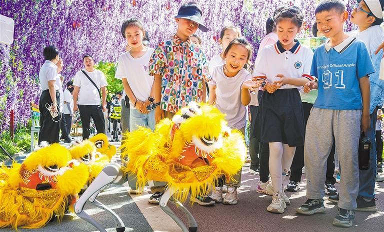 ▼5月2日,安徽省芜湖市繁昌区马仁奇峰景区,小朋友们与机器狗互动。