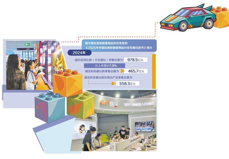 国内市场玩具零售总额继续保持增长。据中国玩具和婴童用品协会发布的《2025年中国玩具和婴童用品行业发展白皮书》统计,2024年,国内市场玩具(不含潮玩)零售总额为978.5亿元,比上年增长7.9%;潮流和收藏玩具零售总额为465.7亿元,潮流和收藏玩具及周边产品零售总额为558.3亿元。