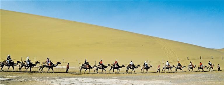 6月2日,游客在甘肃省敦煌市鸣沙山月牙泉景区游览。端午节假期,甘肃省迎来旅游热,众多游客走进敦煌欣赏大漠风光,体验丝路风情。
