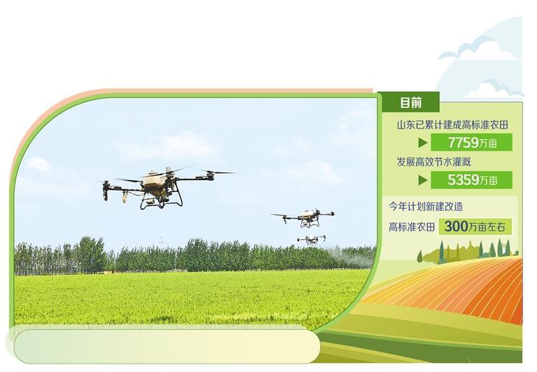 近年来,山东高质量推进高标准农田建设,推动实现粮食增产提质。目前,山东已累计建成高标准农田7759万亩,发展高效节水灌溉5359万亩,为粮食总产量连续4年稳定在1100亿斤以上夯实了基底。