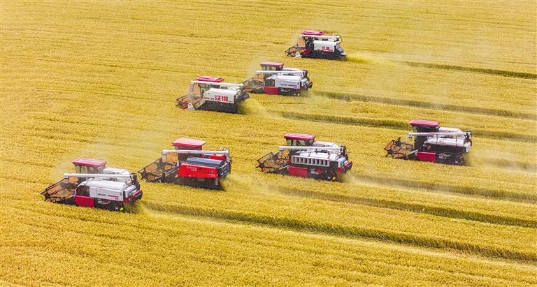 6月3日,江苏省宿迁市宿城区陈集镇鲍河村,农机手驾驶联合收割机在田间收割小麦。 眼下,宿城区39.5万亩小麦陆续进入收获期,农民抢抓晴好天气加紧收割。 徐江海摄(中经视觉)