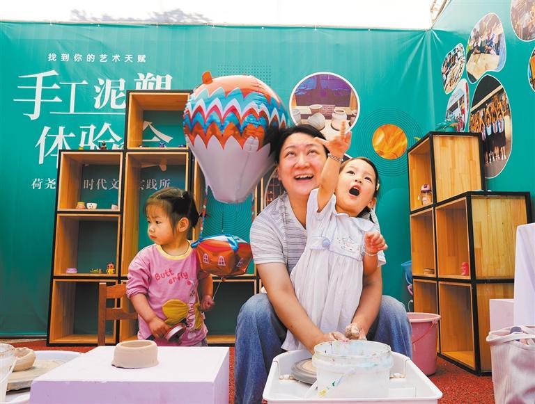 ▼5月31日,江西省萍乡市湘东区龙舟公园,游客在体验手工泥塑。
