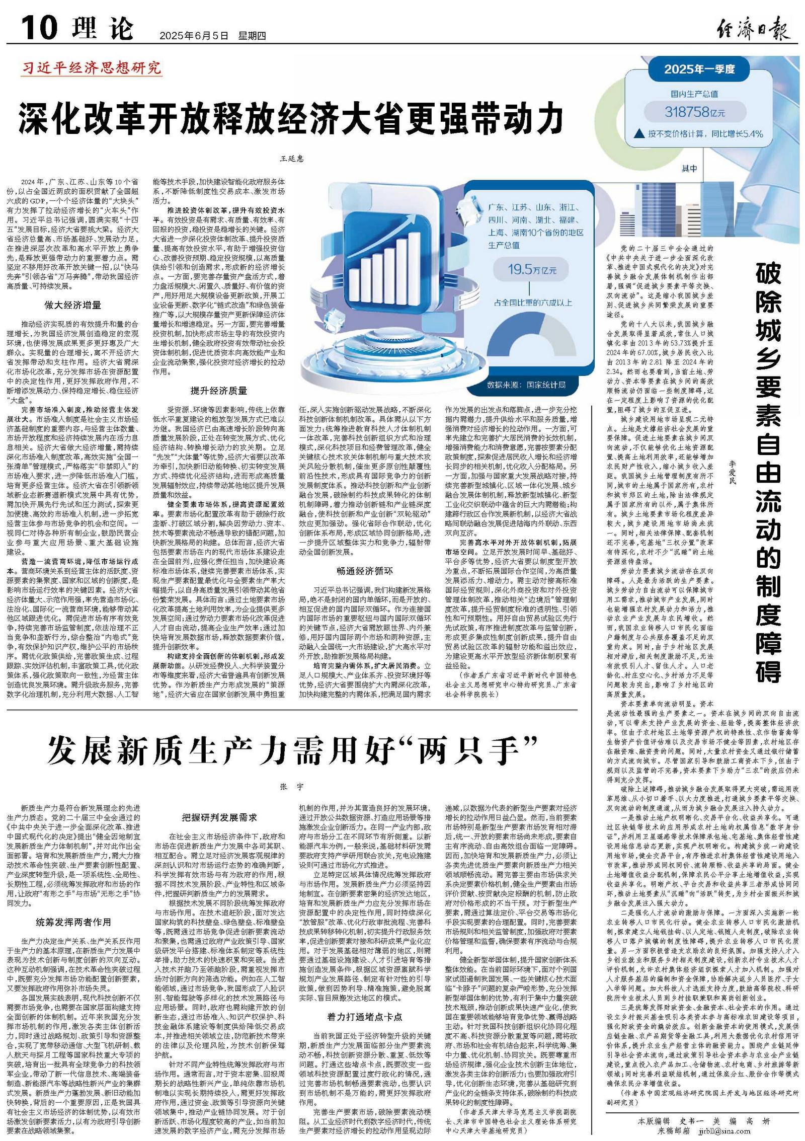 2024年,广东、江苏、山东等10个省份,以占全国近两成的面积贡献了全国超六成的GDP,一个个经济体量的“大块头”有力发挥了拉动经济增长的“火车头”作用。习近平总书记强调,圆满实现“十四五”发展目标,经济大省要挑大梁。经济大省经济总量高、市场基础好、发展动力足,在推进深层次改革和高水平开放上勇争先,是释放更强带动力的重要着力点。需坚定不移用好改革开放关键一招,以“快马先奔”引领各省“万马奔腾”,带动我国经济高质量、可持续发展。