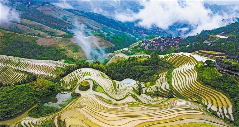6月8日,广西壮族自治区桂林市龙胜各族自治县龙脊梯田层层叠叠,与青山、民居构成一幅醉人画卷。近年来,当地在严格维护梯田生态的基础上,开发出多种旅游产品,以特色产业带动村民增收致富。田文国摄(中经视觉)
