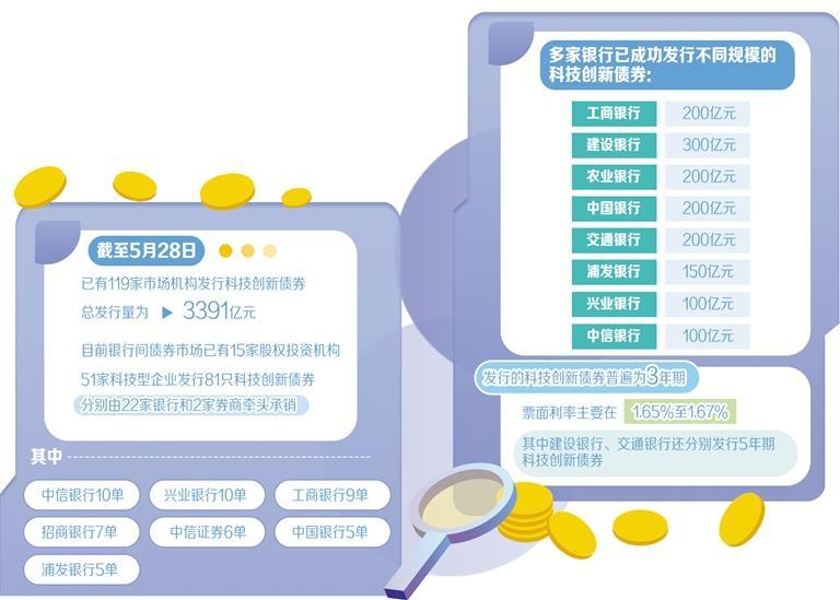 记者从中国人民银行获悉,自5月7日科技创新债券推出以来,截至5月28日已有119家市场机构发行科技创新债券,总发行量为3391亿元。业内普遍预计,未来我国科技创新债券市场或将迎来较高增速的增长,引导资金加速流向科技创新领域。