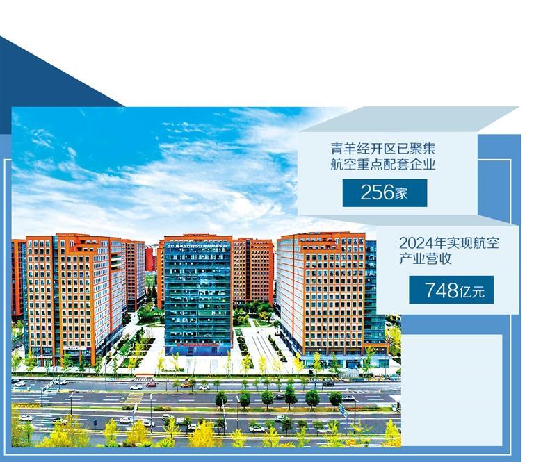 目前,一大批浓缩航空产业“青羊研”“青羊造”实力的前沿成果相继诞生。青羊区航空产业发展主阵地——青羊经开区目前已聚集航空重点配套企业256家。2024年,青羊经开区实现航空产业营收748亿元,在四川省开发区高质量发展综合评价中名列前茅。
