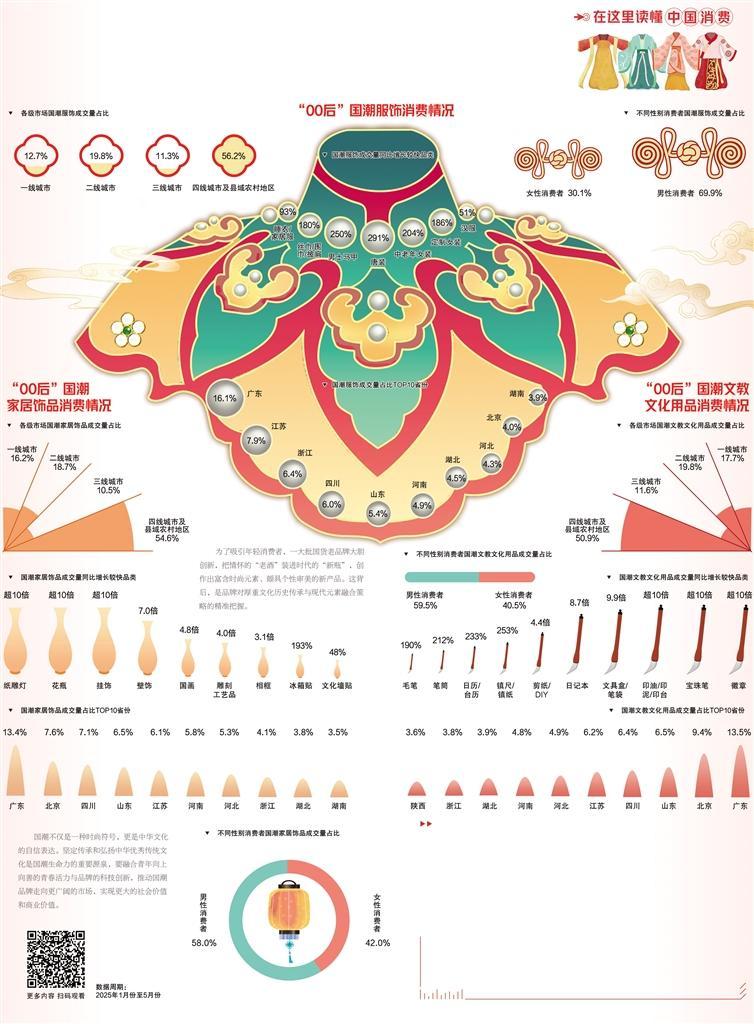 近年来,国风国潮在年轻群体中持续升温,成为“00后”表达个性、追求文化认同的重要方式。今年以来,国风国潮商品在服饰内衣、家居饰品、文教文化用品等多个品类表现亮眼,展现出“00后”对传统文化和个性表达的双重热情。
