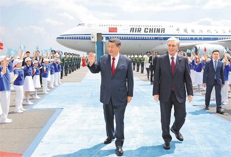 习近平抵达阿斯塔纳纳扎尔巴耶夫国际机场时,托卡耶夫总统率总统办公厅主任达杰拜、副总理兼外长努尔特列乌、总统外事顾问卡济汉、阿斯塔纳市长卡瑟姆别克等高级官员热情迎接。身着盛装的哈萨克斯坦女青年向习近平献花。礼兵分列蓝地毯两侧致敬,哈萨克斯坦少年儿童手持中哈两国国旗热烈欢迎习近平到访。习近平在托卡耶夫陪同下观看仪仗队分列式,直升机悬挂中哈国旗从机场上空飞过。在机场贵宾楼内,两国元首还共同欣赏哈萨克斯坦少年儿童的文艺表演。