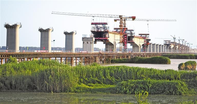 6月16日,江苏省淮安市宁淮城际铁路洪泽至金湖双线特大桥建设现场,工人正在施工。宁淮城际铁路是江苏省沿江城市群城际铁路骨干线、长三角城际轨道交通网的组成部分,建成运营后将对完善区域城际轨道交通网络具有重要意义。