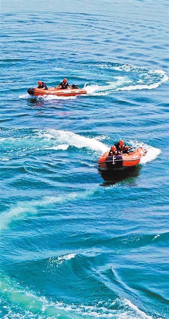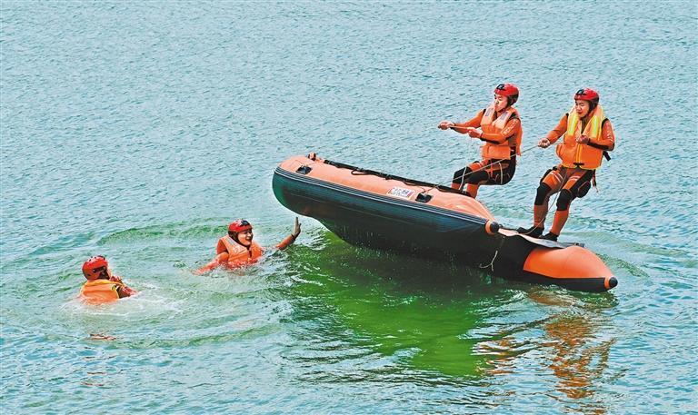 ▶5月7日,救援人员在河南省南阳市白河水域进行水上救援演练。