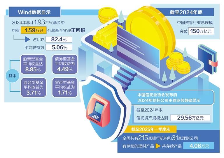公募基金快速增长,领跑行业。《报告》显示,2024年,A股整体上呈上涨趋势,大盘价值总体占优。公募基金行业费率改革持续推进,制度持续完善,行业规模达43.43万亿元,增速领跑全行业。投资收益方面,Wind数据显示,2024年总计1.93万只基金中约有1.59万只公募基金实现正回报,占比达82.4%,平均收益为5.06%。其中,股票型基金平均收益达8.85%;债券型基金平均收益为4.49%;混合型、货币型基金平均收益分别为3.71%、1.71%。