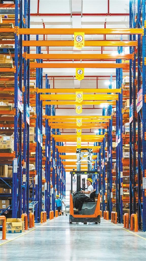 ◀6月16日,工作人员在浙江省金华市金义综保区云仓内搬运跨境商品。杨梅清摄(中经视觉)