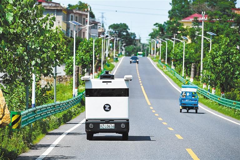 ▼6月16日,无人驾驶快递车行驶在江西省宜春市竹亭镇的乡间道路上。该无人车可降低运输成本、提高投件效率,让更多乡村实现寄递服务。
