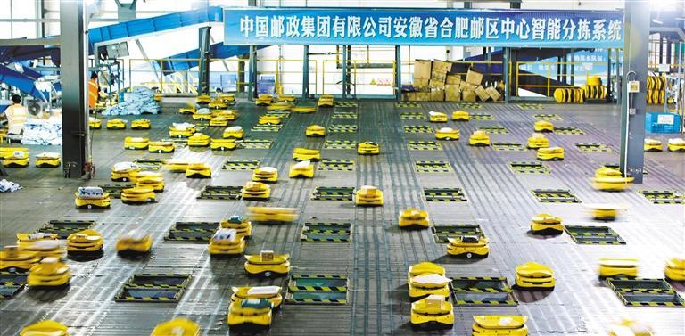 ▼6月16日,安徽省合肥市新站高新区中国邮政合肥邮区中心,200余台智能分拣机器人在作业平台上进行精准分拣。张 敏摄(中经视觉)