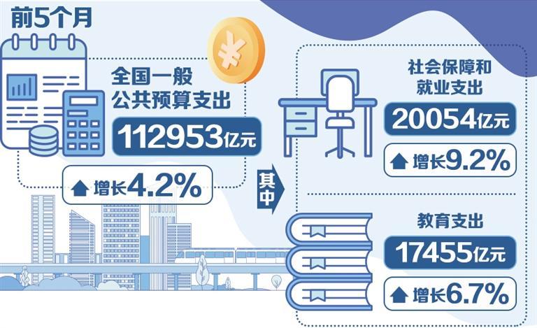 支出方面,各级财政部门认真落实更加积极的财政政策,加大支出强度,优化支出结构,持续加强对重点领域的支出保障。前5个月,全国一般公共预算支出112953亿元,增长4.2%。其中,社会保障和就业支出20054亿元,同比增长9.2%;教育支出17455亿元,增长6.7%;卫生健康支出8896亿元,增长3.9%。