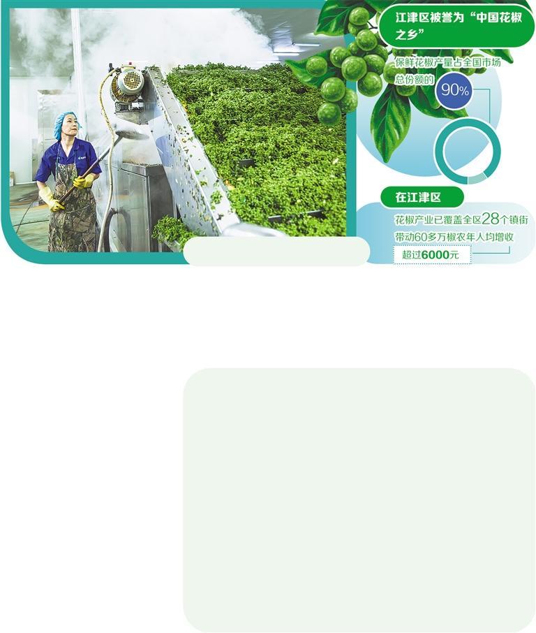 江津区地处长江之畔,被誉为“中国花椒之乡”,保鲜花椒产量占全国市场总份额的90%。近年来,该区立足资源优势,把花椒产业作为现代农业主导产业进行培育,不断扩大规模、做优品质、做强品牌,把小花椒打造成致富大产业。如今,江津的花椒种植面积达到53万亩,花椒产业实现从传统种植卖鲜椒的单一模式到全产业链融合发展的跨越升级,全产业链综合产值超过55亿元,带动60多万椒农走上增收致富路。