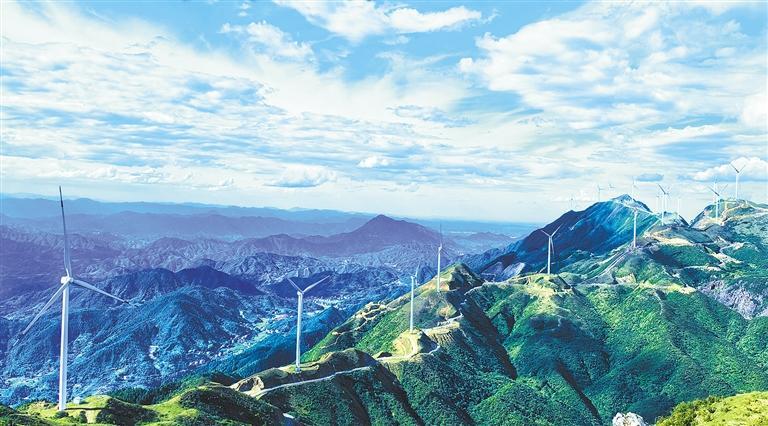 6月17日,江西吉安遂川与赣州上犹交界山脉一带,巨型风机擎天而立,错落有致,别有一番风景。近年来,当地大力发展清洁能源,形成发展与保护相得益彰的局面。
