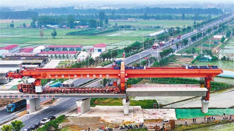 6月21日,潍宿高铁郯城沭河特大桥施工现场,中铁上海局工作人员在进行箱梁架设。当日,潍宿高铁山东临沂段首榀箱梁架设成功,正式进入线上架梁施工阶段。潍宿高铁是京沪高铁辅助通道的重要组成部分。