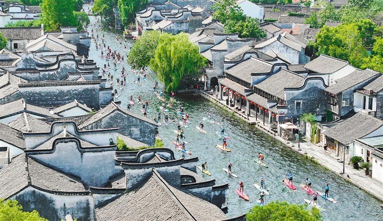 6月21日,浙江省湖州市南浔古镇景区,第七届南浔古镇桨板公开赛鸣笛开赛,来自全国各地的百余名桨板选手同场竞技。选手们在比赛的同时,还可一览古镇风貌,体验在江南水乡开展水上运动的独特乐趣。陈海伟摄(中经视觉)