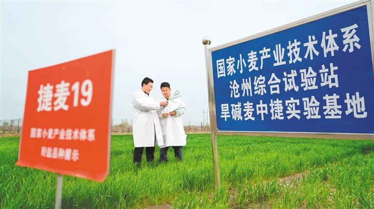▲4月8日,黄骅市旱碱麦中捷实验基地,农业专家在查看麦苗长势。黄骅市不断进行良种选育工作,先后培育了“冀麦32”“捷麦19”“捷麦20”等耐盐碱、抗病性强的小麦品种,旱碱麦产量逐年“步步高”。