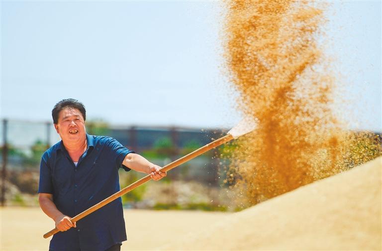 ▼6月10日,黄骅市友和种植专业合作社种粮大户张志清在翻晒小麦。作为旱碱麦标准化种植示范区,合作社创新实施旱碱麦轮作模式,实现亩产突破与生态效益双赢。