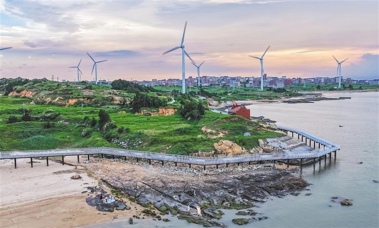 6月22日,福建省福清市三山镇龙高半岛,风力发电机组与碧海蓝天、青山民居、滨海栈道共同构成一幅滨海生态画卷。近年来,当地大力发展风力发电产业,形成集风能开发、观光旅游、环保示范于一体的沿海风电长廊,推动全域旅游发展。