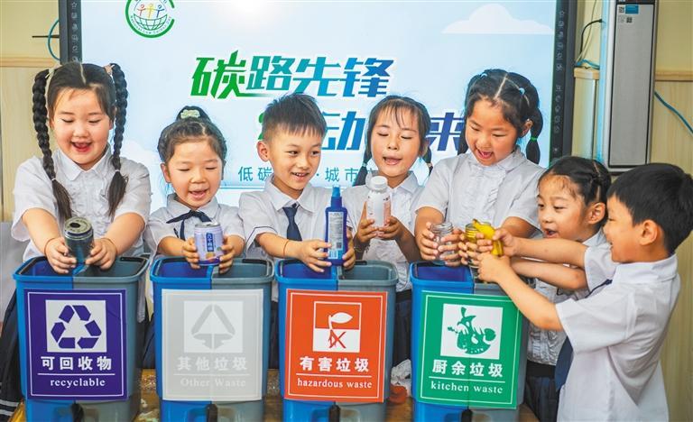 ◀6月23日,江苏省宿迁市宿豫区顺河中心幼儿园,小朋友在学习垃圾分类知识。