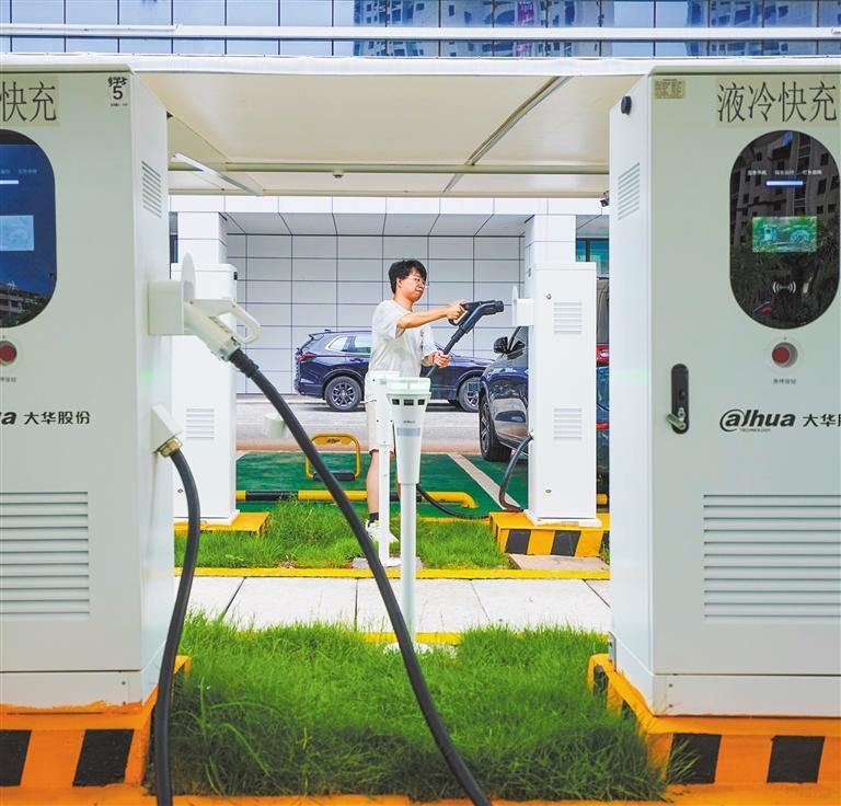 ◀6月23日,市民在江西省抚州市南丰县琴城镇为新能源车充电。近年来,该县加快推进新能源基础设施建设,让市民绿色出行更加便捷。