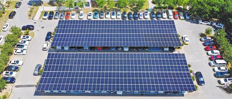 ▼6月13日,新能源汽车在辽宁省沈阳市“光储充放”一体化项目能源站充电。该充电站年均发电量约53万千瓦时,年减少碳排放量约429吨。