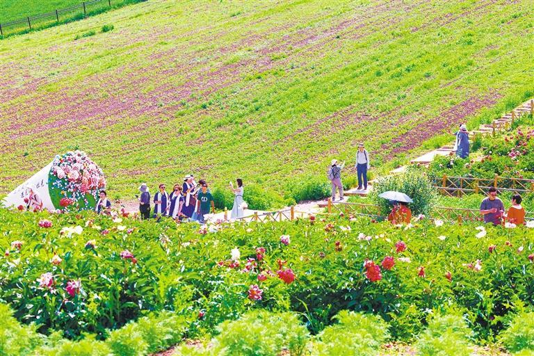 近日,游客在新疆昌吉回族自治州奇台县境内的江布拉克景区游玩。盛夏的江布拉克景区美景如画,吸引众多游客前来欣赏风景、打卡拍照。孙振嵩摄(中经视觉)