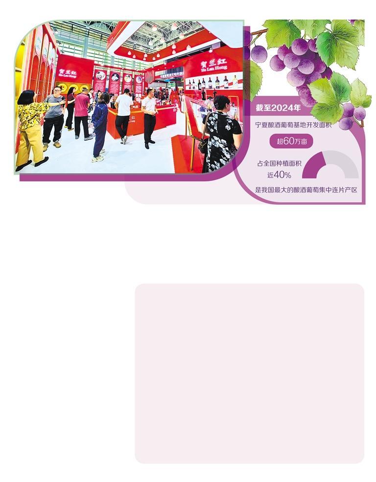 经过40多年的发展历程,宁夏不仅让一串串酿酒葡萄在戈壁上扎下了根,还让其成为日渐壮大的“紫色产业”。截至2024年,宁夏酿酒葡萄基地开发面积超60万亩,占全国种植面积近40%,是我国最大的酿酒葡萄集中连片产区,葡萄酒年灌装量约1.4亿瓶。