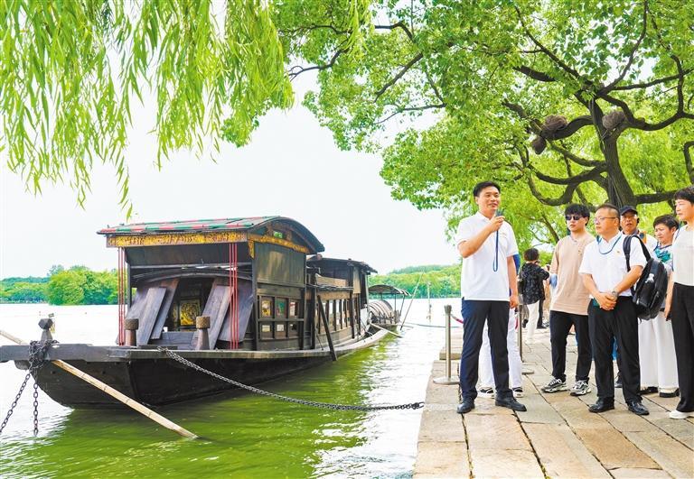 ◀6月21日,浙江省嘉兴市南湖,浙江省级文化特派员田建明(左一)正在宣讲“红船精神”。今年是“红船精神”提出20周年。盛佳淳摄(中经视觉)