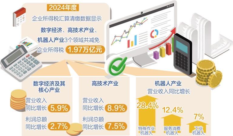 数字经济、高技术产业、机器人产业3个领域是新质生产力的典型代表。记者7月1日从国家税务总局获悉,5月底结束的2024年度企业所得税汇算清缴数据显示,这3个领域共减免企业所得税1.97万亿元,总营业收入同比增长7.1%,利润总额同比增长5.2%。