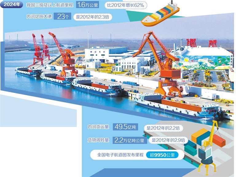 内河航运是综合交通运输体系的重要组成部分,具有运能大、成本低、绿色低碳等比较优势。党的十八大以来,我国航道网络体系不断完善。数据显示,2024年我国三级及以上的航道里程达到1.6万公里,比2012年增长了62%,长江、西江、京杭运河等主干线大通道能力持续提升,江汉运河、江淮运河建成通航,平陆运河等一大批重大工程加快推进,国家高等级航道建设不断加快。