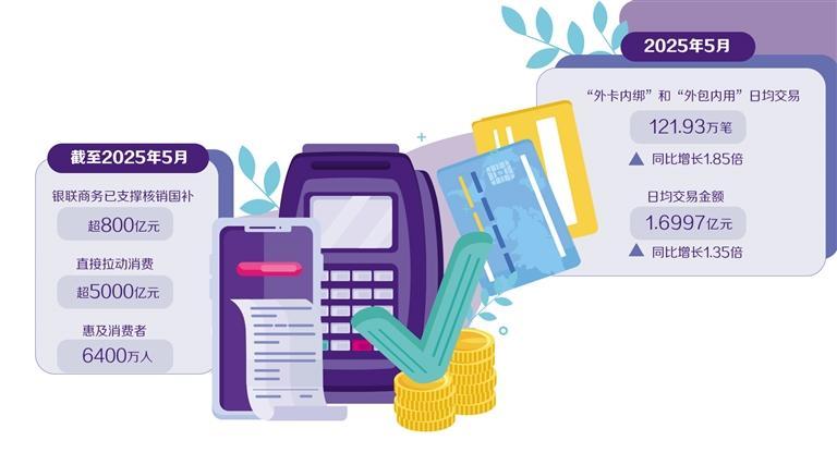 据介绍,“外卡内绑”和“外包内用”是为便利来华人员支付推出的移动支付服务:“外卡内绑”是指使用微信支付、支付宝等直接绑定境外银行卡就能支付;“外包内用”是指使用境外钱包应用扫码就能够完成支付,无需下载其他应用程序。网联数据显示,2025年5月,“外卡内绑”和“外包内用”日均交易达121.93万笔、日均交易金额1.6997亿元,同比分别增长1.85倍和1.35倍。