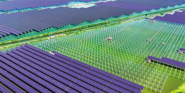 近年来,江苏连云港灌云县充分利用沿海区域盐碱滩涂地,采取渔光互补、农光互补等模式,打造集光伏电站建设、光伏新型技术示范、特色养殖、生态治理修复于一体的“光伏+”绿色发展基地,助力经济发展。图为该县圩丰镇沿海滩涂区壮观的光伏板。