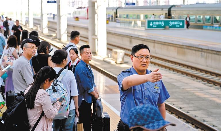 7月4日,国铁沈阳局长春站站台客运员韩圣超(右)在组织旅客有序乘降。