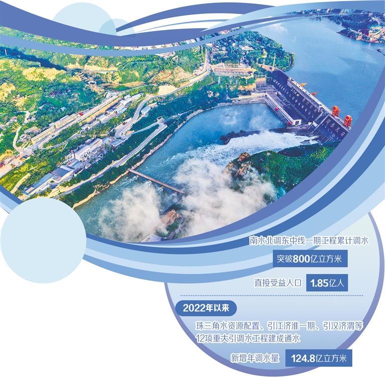 水利部规划计划司司长张祥伟介绍,目前,南水北调东中线一期工程累计调水突破800亿立方米,直接受益人口达1.85亿人。2022年以来,珠三角水资源配置、引江济淮一期、引汉济渭等12项重大引调水工程建成通水,新增年调水量124.8亿立方米;西江大藤峡、新疆大石门等24座大型水库建成投用;新开工的黄河古贤水利枢纽等31项流域防洪控制性工程和重点水源工程建成后可新增供水能力49亿立方米。