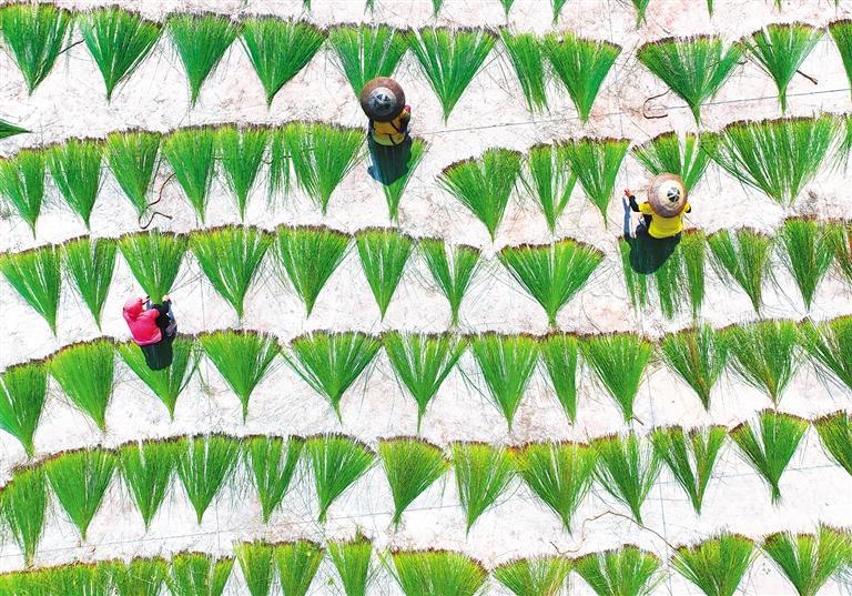 7月8日,在湖南省衡阳市祁东县金桥镇,当地村民在晾晒蔺草。金桥镇是传统的蔺草之乡,当地利用冬闲田种植蔺草,蔺草成熟收割后再播种水稻,稻、草轮作助当地群众增收。