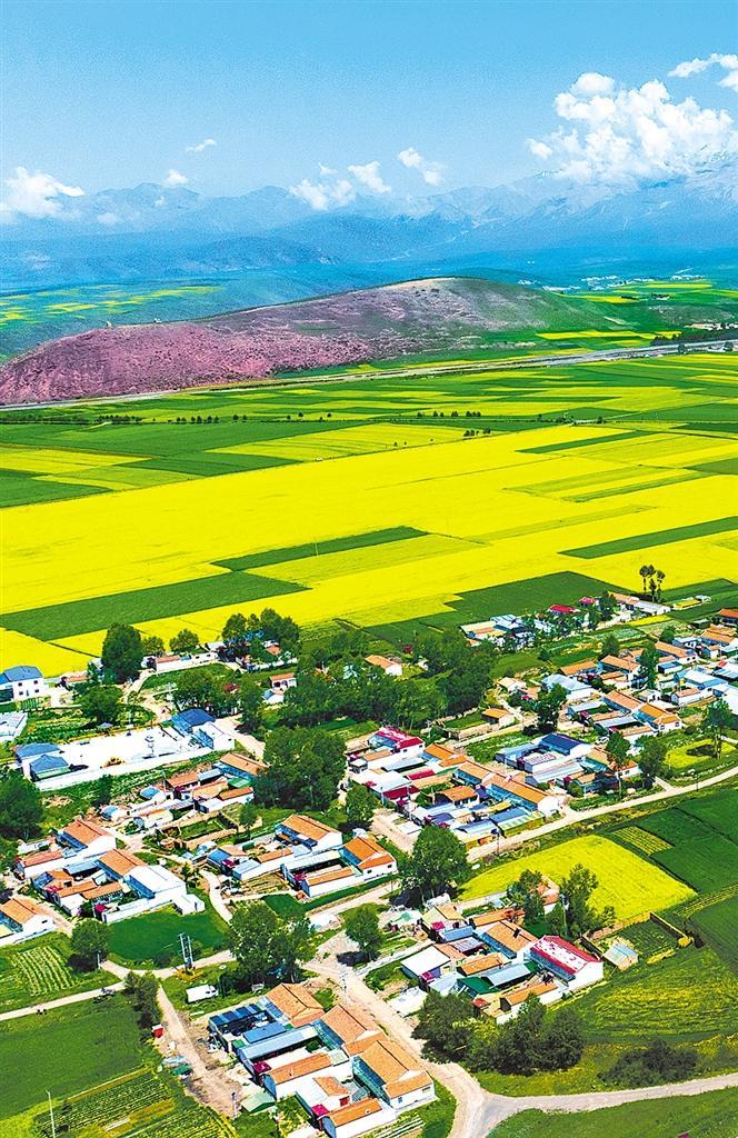 7月11日,青海省海北州门源回族自治县万亩油菜花田进入盛花期,与村庄、山峰和蓝天白云交相辉映,构成一幅美丽的田园画卷。杨 潇摄(中经视觉)