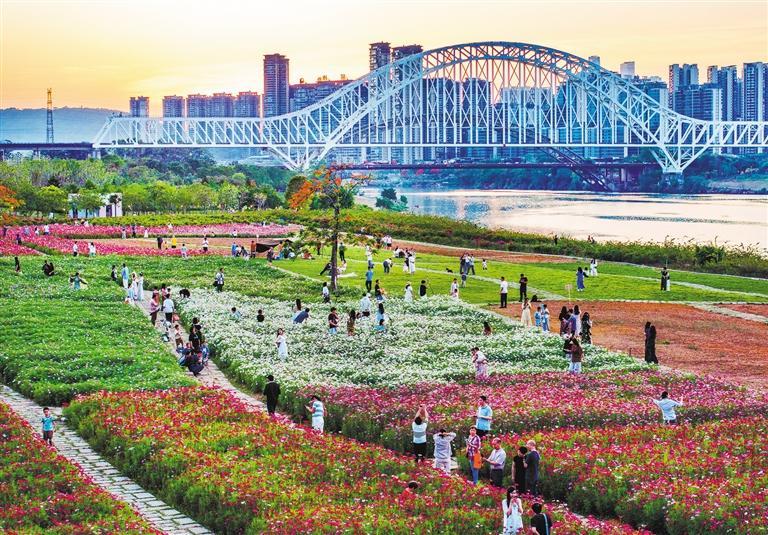5月12日,广西壮族自治区南宁市邕宁区江湾路三岸大桥绿道旁的格桑花盛开,吸引众多市民前来观赏。