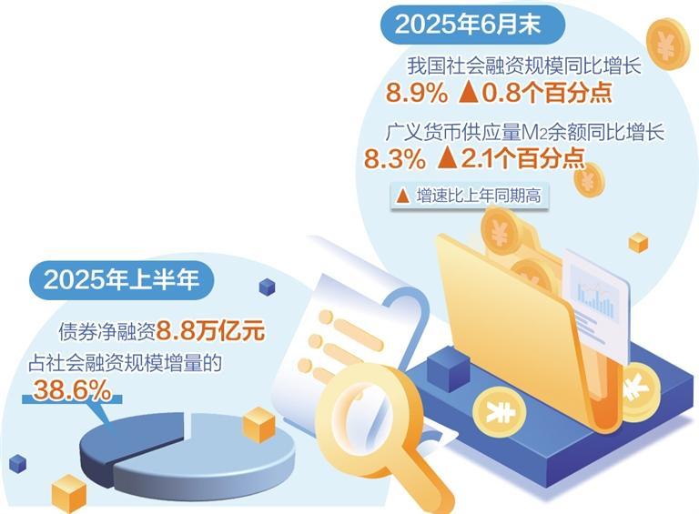 中国人民银行调查统计司司长闫先东表示,从今年上半年金融总量数据来看,社会融资规模、货币供应量平稳增长,同经济增长、价格总水平预期目标相匹配。6月末,我国社会融资规模和广义货币供应量M_2余额同比增长8.9%和8.3%,增速分别比上年同期高0.8个和2.1个百分点。
