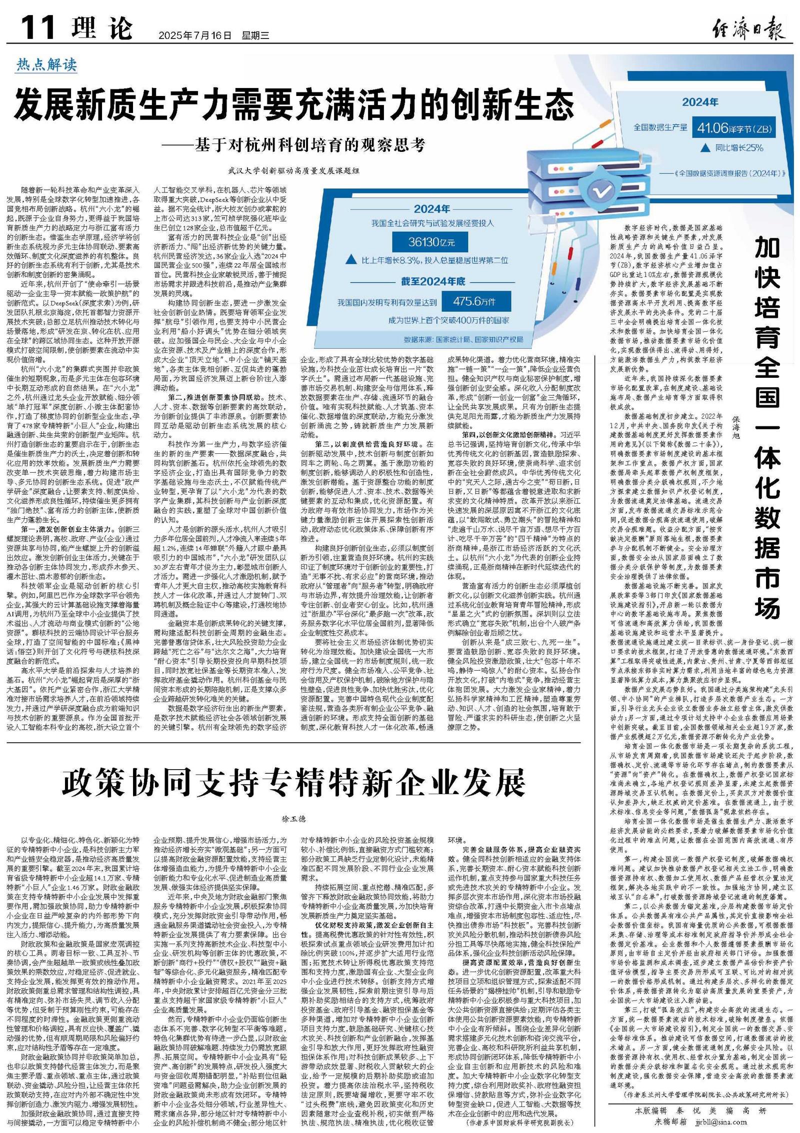 数据是数字经济衍生出的新生产要素,是数字技术赋能经济社会各领域创新发展的关键引擎。杭州有全球领先的数字经济企业,形成了具有全球比较优势的数字基础设施,为科技企业茁壮成长培育出一片“数字沃土”。需通过布局新一代基础设施、完善市场交易机制、构建安全与信用体系,释放数据要素在生产、存储、流通环节的融合价值。唯有实现科技赋能、人才筑基、资本催化、数据增值的深度联动,方能充分激发创新涌流之势,铸就新质生产力发展新动能。