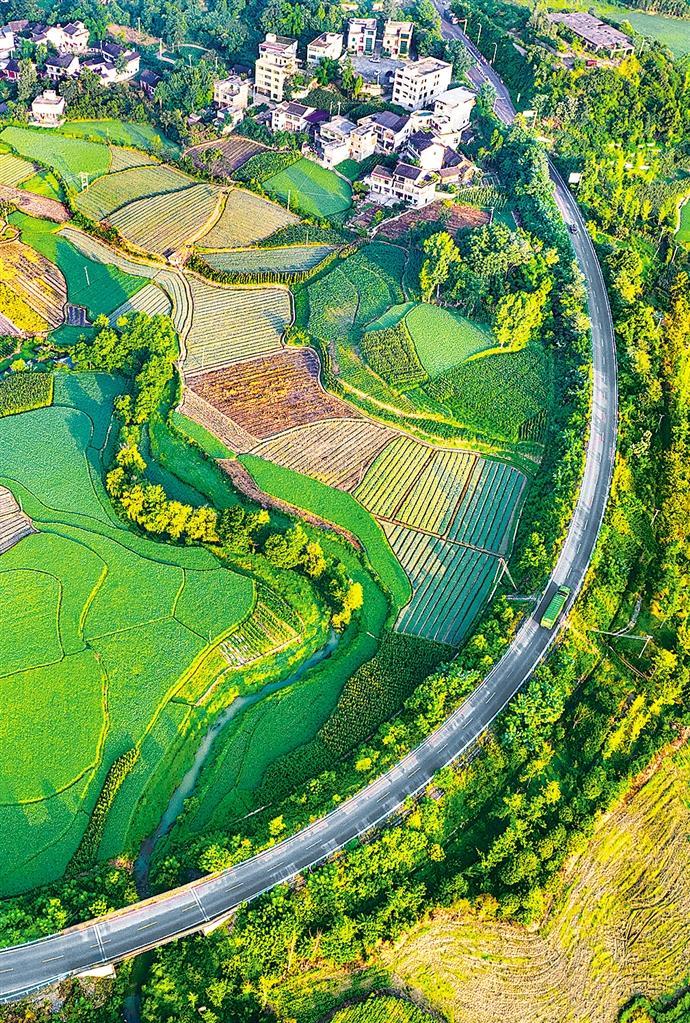 7月16日,贵州省黔西市,公路穿过田园。近年来,当地大力推进交通路网建设,高速公路、国道省道、县乡公路等通车里程不断增长,有效推动了地区经济高质量发展。