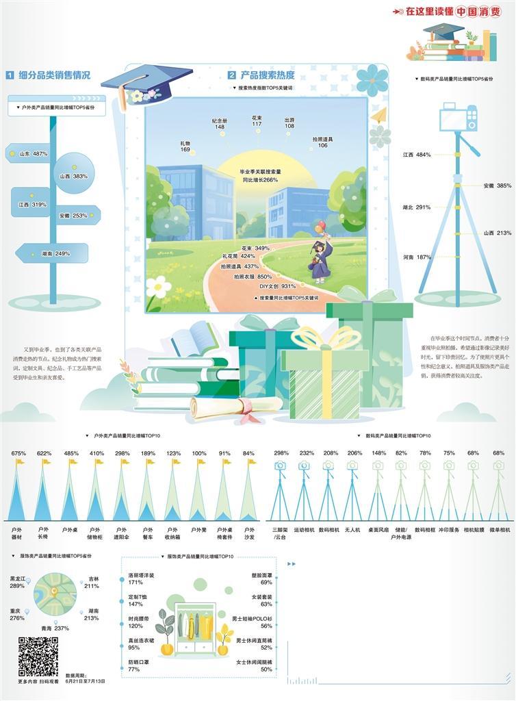 毕业季是一年中充满离别与回忆的特殊时期,标志着学生完成一个阶段的学业,从此迈向人生的新阶段。毕业季的到来也带动了相关产品的热销,数码、服饰、户外出行等消费领域表现更为明显。
