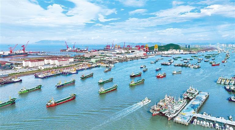 七月十九日,浙江省舟山市,休渔的渔船有序停泊,在蓝天白云映衬下,构成一幅夏日渔港风光画卷。
