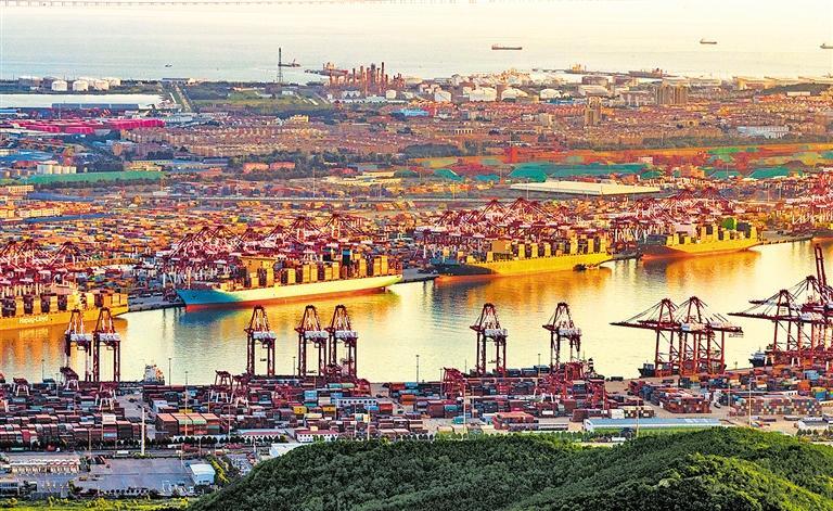 近日,山东港口青岛港前湾集装箱码头朝霞辉映,气韵万千。集装箱船在泊位上进行装卸作业,一派繁忙景象。韩加君摄(中经视觉)