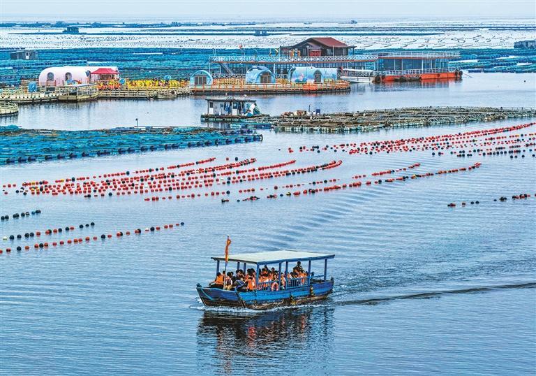 近日,在山东省荣成市石岛管理区桑沟湾海洋牧场,游客乘坐游船欣赏海上风光,还在现场垂钓、采收贝类,体验耕海牧渔之趣。目前正值休渔期,当地依托国家级海洋牧场,开展文旅产业,将蔚蓝海域转化为乡村全面振兴的“蓝色动能”。李信君摄(中经视觉)