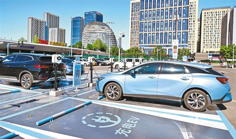 6月21日,北京冬奥村,电动汽车在充电。随处可见的汽车充电桩为市民出行“续航”。